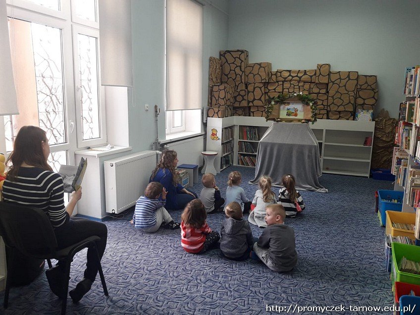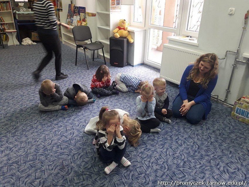 Czas spędzony w bibliotece uznajemy za bardzo owocny, nie obeszło się bez zabaw, które Smyki tak bardzo uwielbiają. Na zakończenie wysłuchaliśmy bajki o Kubusiu Puchatku, który wyczekiwał wiosny.