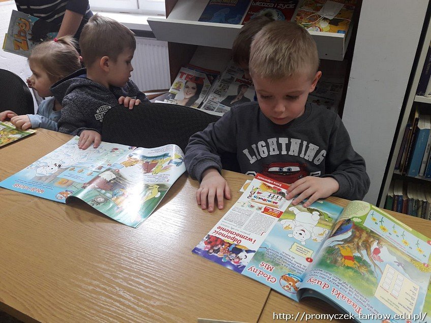 Po przybyciu na miejsce, dzieci zapoznały się z biblioteką, poznały jej pomieszczenia min. czytelnie. Pani bibliotekarka pokazała w jaki sposób wypożycza się książki oraz przedszkolaki miały okazje usiąść w czytelni i pooglądać czasopisma dla nich stworzone. Dzieci przypomniały sobie bajkę o Kubusiu Puchatku, Czerwonym Kapturku, Pinokiu oraz o Małej Syrence.