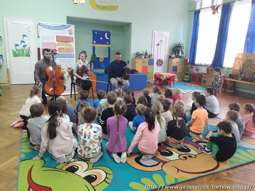 12 kwietnia do naszego przedszkola zawitali goście z Pracowni "Jaszczur i Przyjaciele". Tego dnia tematem zajęć muzycznych były instrumenty smyczkowe: altówka, skrzypce i kontrabas.