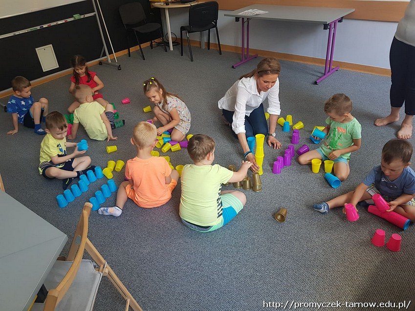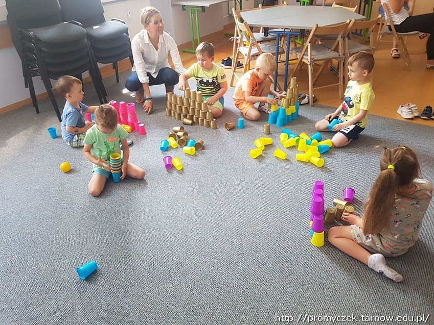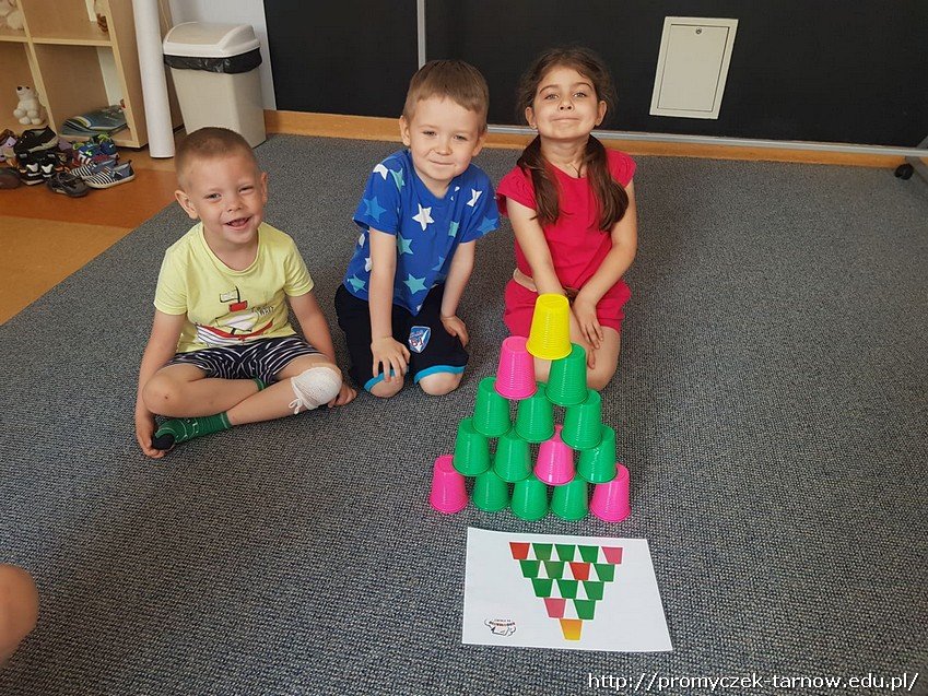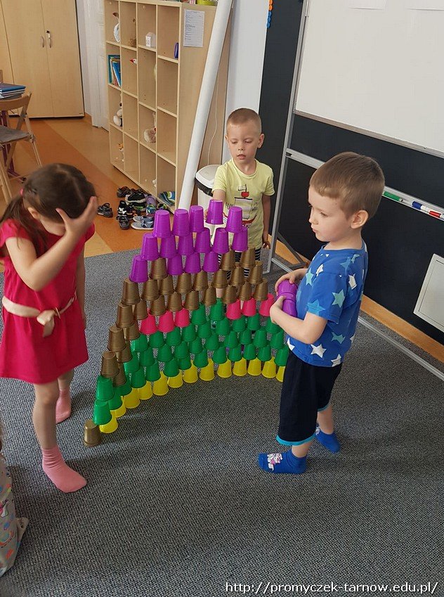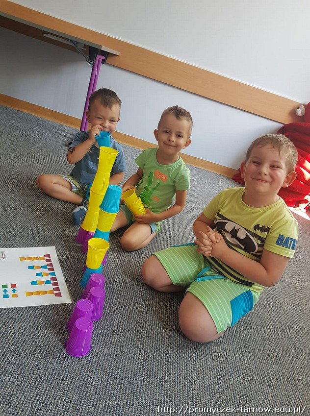 Kolejnym etapem warsztatów było odtworzenie z narysowanego kodu wieży z kolorowych kubków, które później dzieci zbijały piłeczkami.