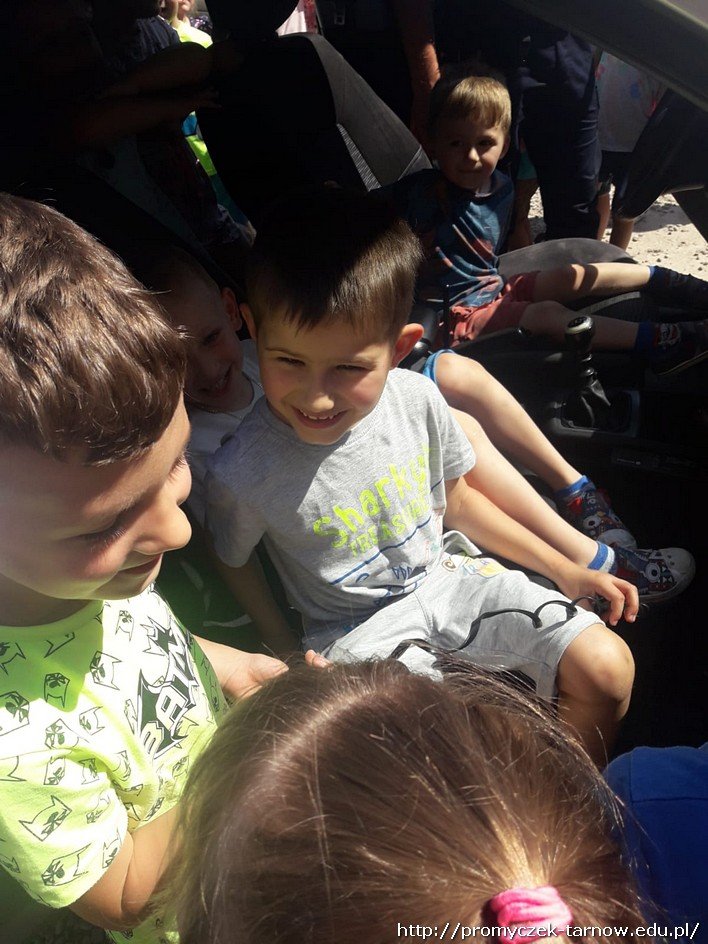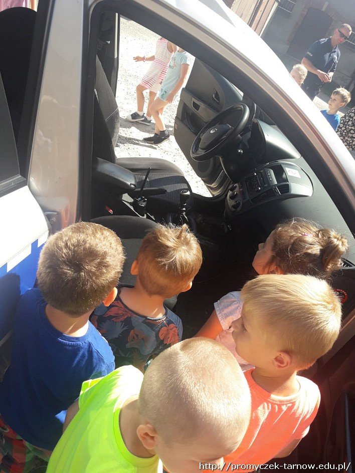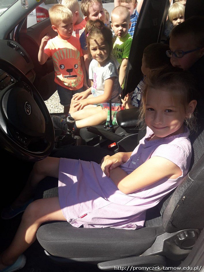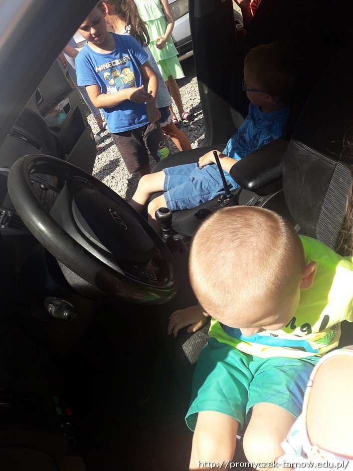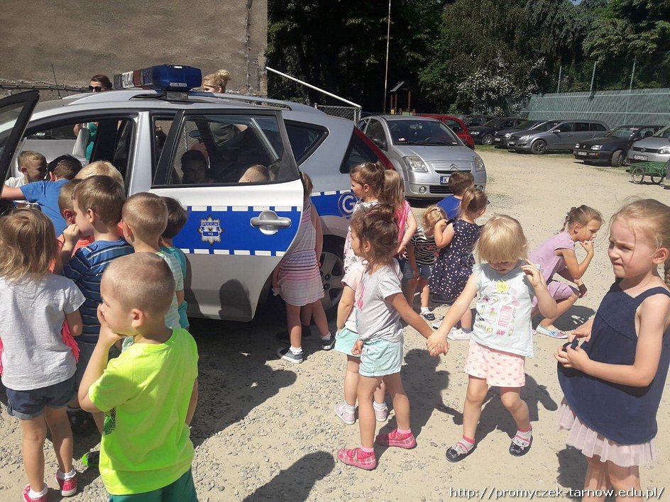 Po krótkiej pogadance zeszliśmy na parking oglądać radiowóz policyjny. Promyczki z chęcią wsiadały do środka, czerpiąc z tego wiele radości. Bardzo dziękujemy panom policjantom była to ważna i pomocna lekcja o bezpieczeństwie.