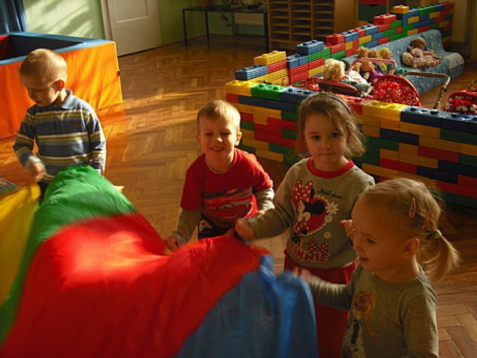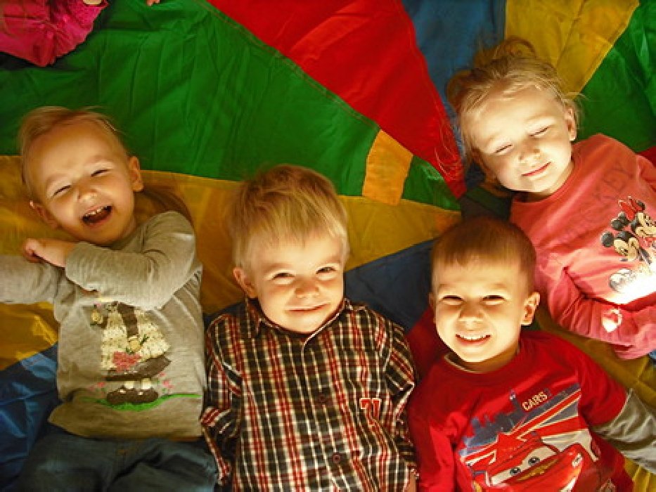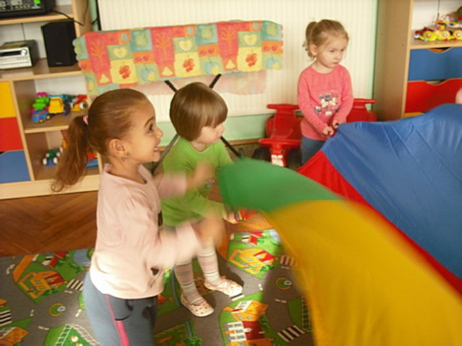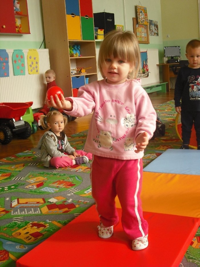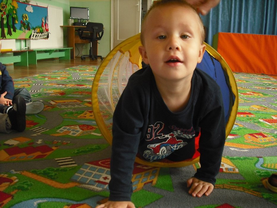 Nie tylko średniaki i starszaki uczestniczą w zajęciach kółka sportowego, maluchy również! Pod czujnym okiem pani Uli i pani Danusi, Smyki ćwiczyły koordynację ruchową oraz usprawniały funkcje dużej motoryki. Najwięcej frajdy sprawiło dzieciom przechodzenie przez tunel. Nie lada niespodzianką były również zabawy z chustą animacyjną