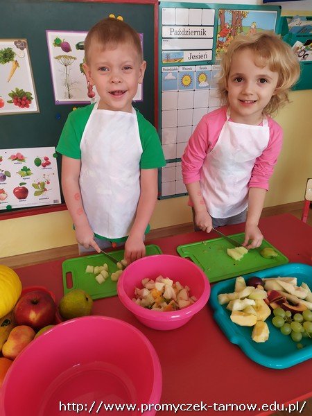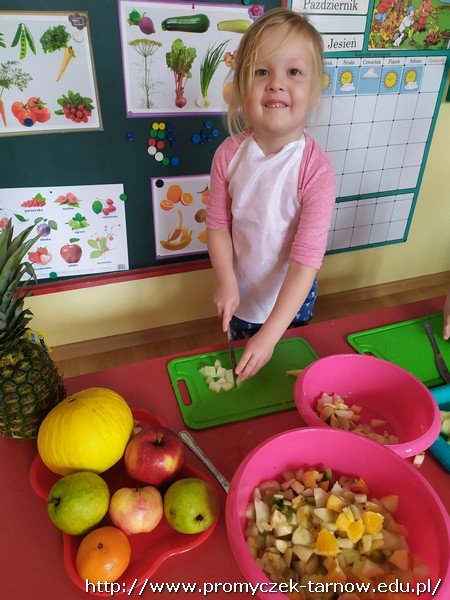 Najpierw oczywiście musieliśmy przypomnieć sobie nazwy przyniesionych owoców, przygotować je, a następnie wszyscy ochoczo zabrali się do krojenia. Sałatka wyszła wspaniale - było pysznie, kolorowo i zdrowo!