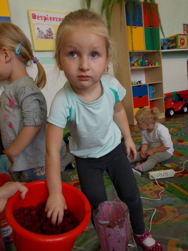 Na środku dywanu rozścielona była folia, na niej stały kubeczki, pojemniki i mikser. Dzieci odgadywały co będzie się dziś działo. Okazało się, że wszyscy będą wspólnie przygotowywać pyszny i zdrowy jogurt malinowy!