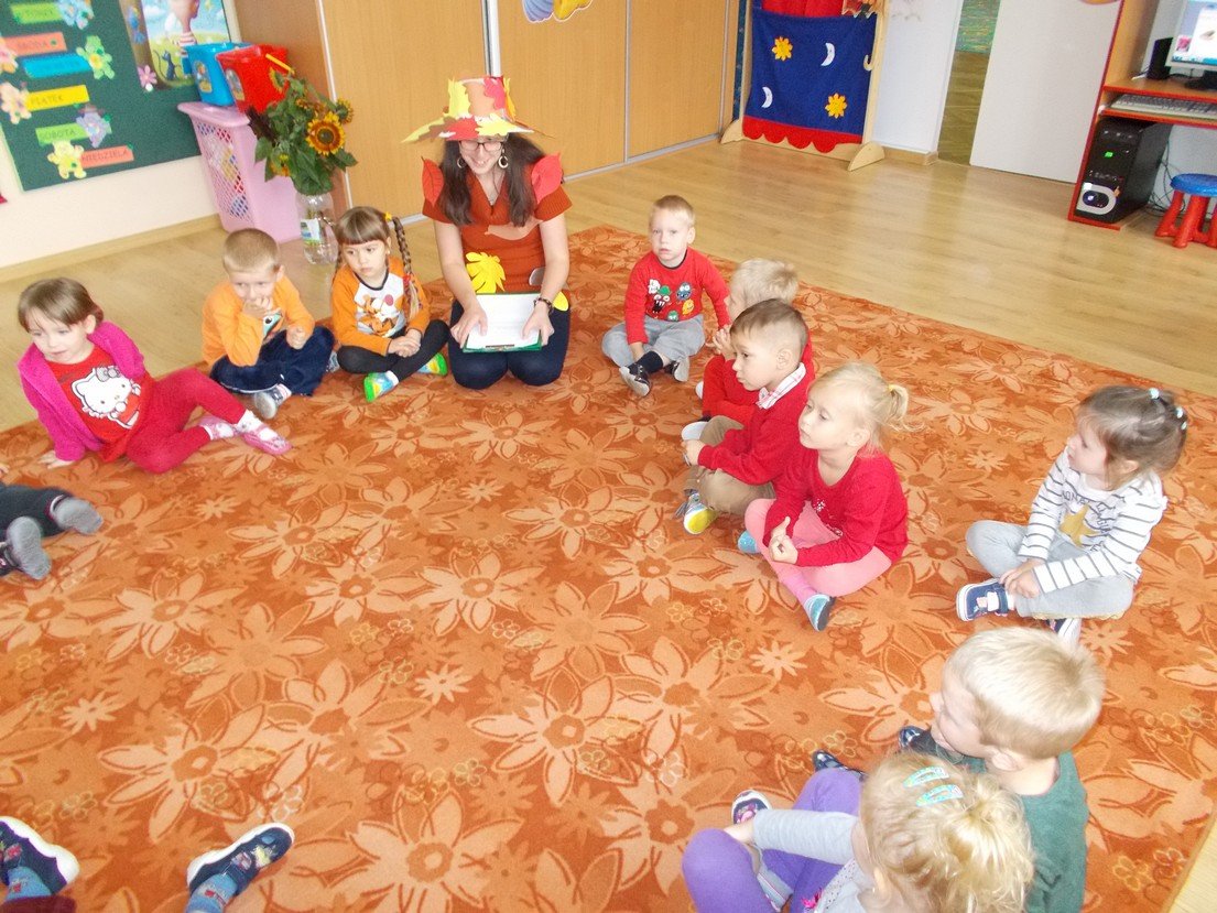 Dzieci z grupy Smyki i Asy zebrały się w jednej sali. Kiedy wszyscy usiedli w pięknym kole dało się słyszeć pukanie do drzwi i nieznany głos… Okazało się, że to sama Pani Jesień w kapeluszu z liści i z koszem wspaniałych darów! Przedszkolaki przywitały ją radośnie i zaprosiły do koła.
