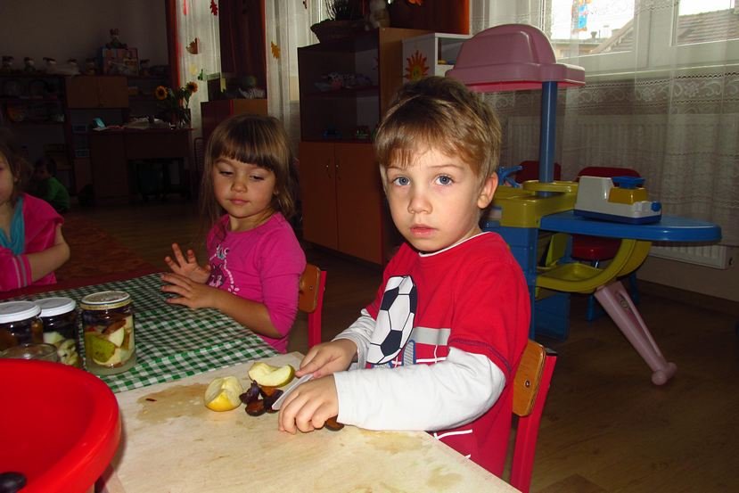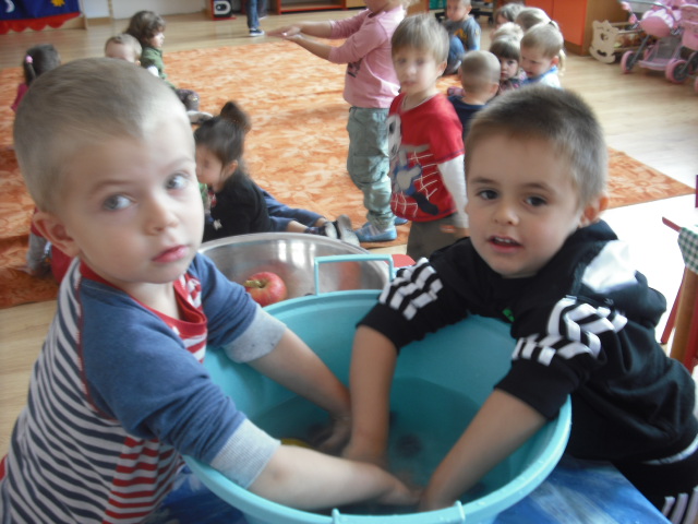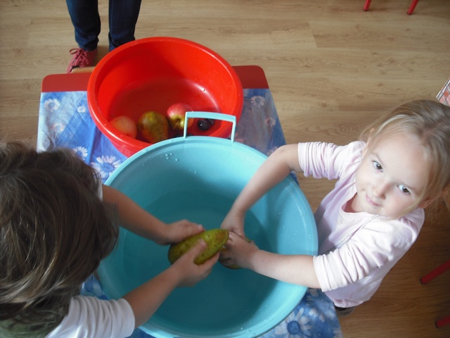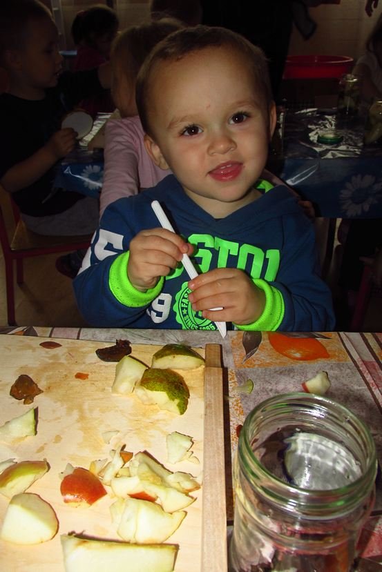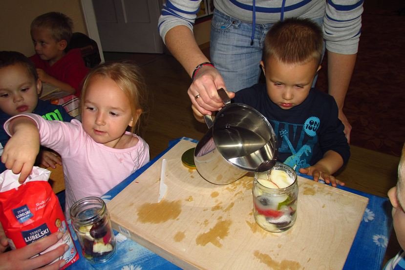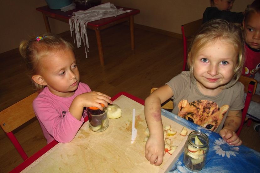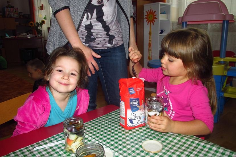 W pierwszym tygodniu października grupa Asy realizowała temat "Jesień w sadzie". W związku z tym pani Paulina przygotowała dzieciom wielką niespodziankę - zaproponowała im przygotowywanie kompotów! Nasze małe Promyczki lubią współdziałanie, dlatego do tak poważnej pracy zaprosiły grupę Smyki.