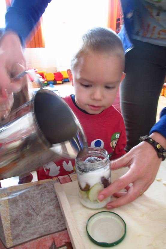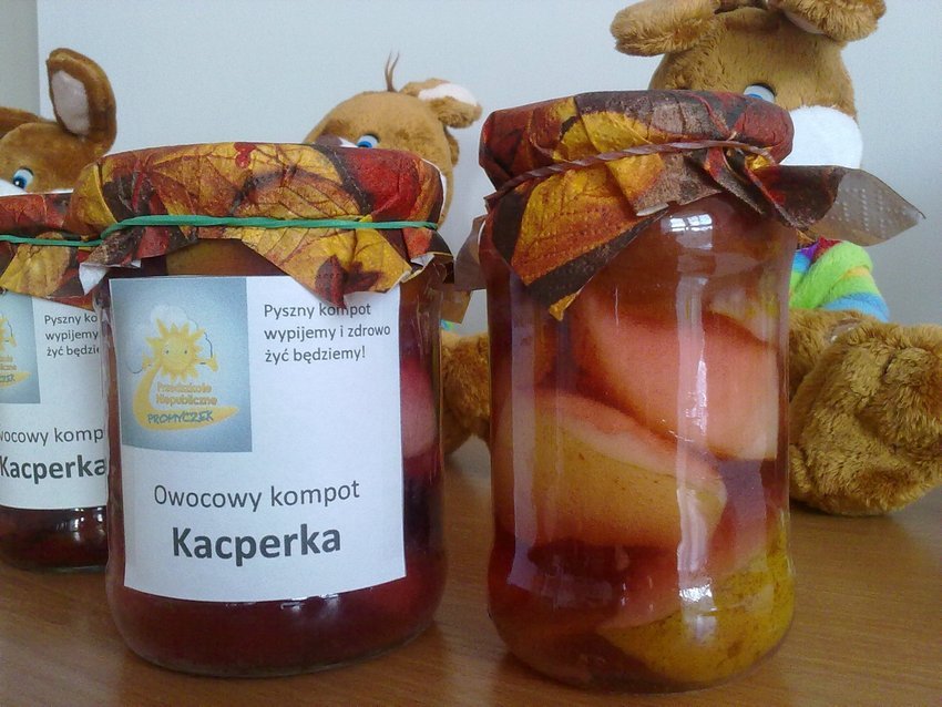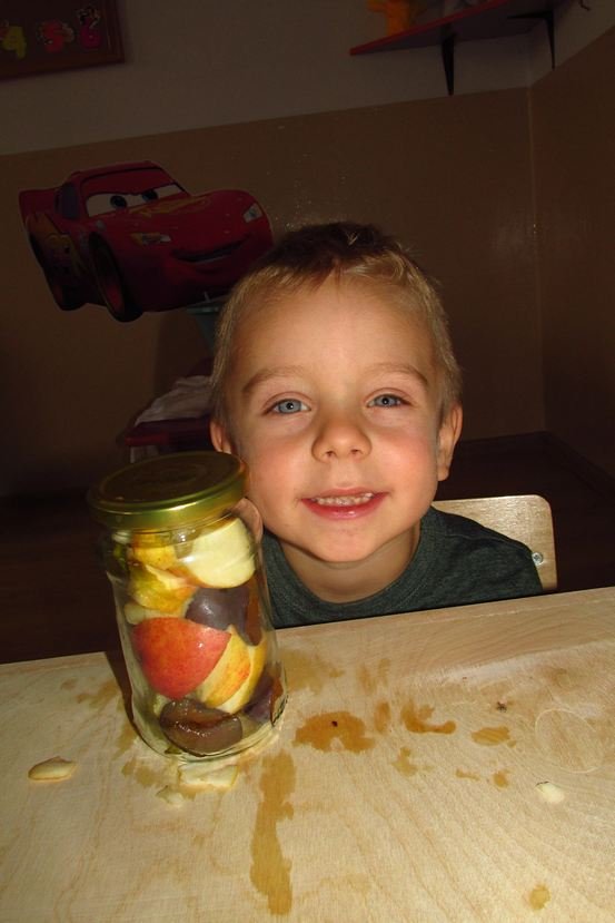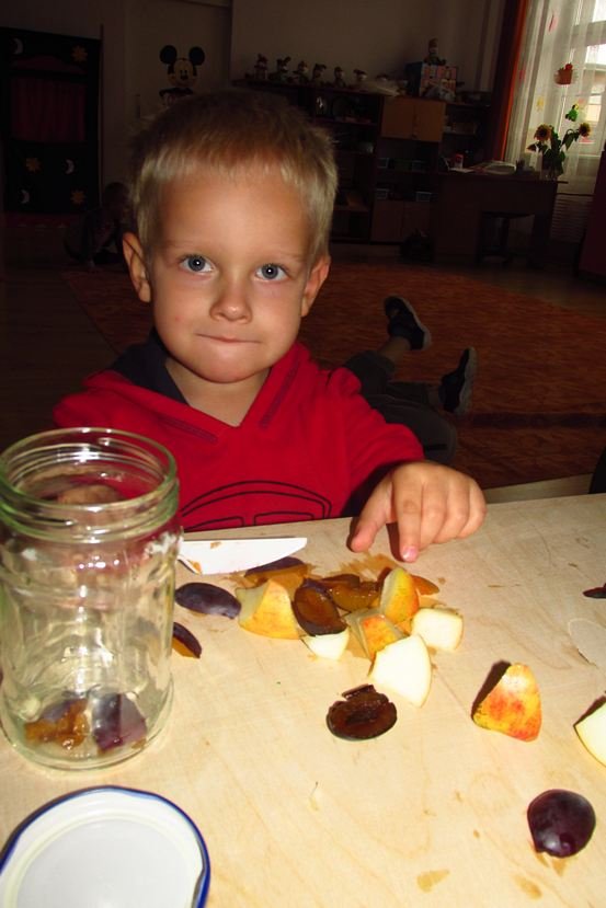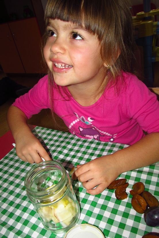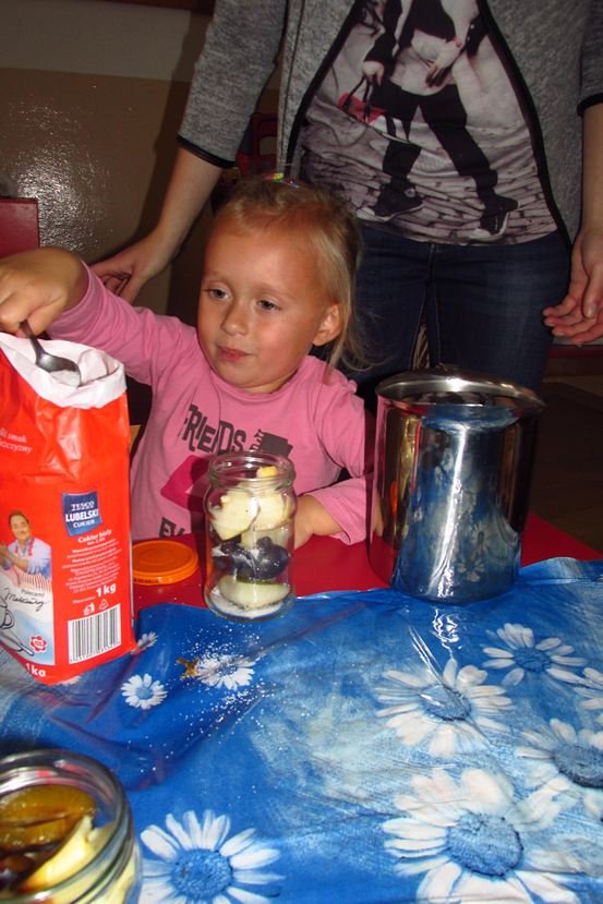 Przygotowywanie kompotów rozpoczęło się od gruntownego umycia jabłek, gruszek i śliwek. Następnie przedszkolaki dostały plastikowe nożyki i kroiły swoje owoce. Każdy, kto miał problem, mógł liczyć na pomoc pani Ani i pani Pauliny. Gdy owoce wylądowały w słoikach, nadszedł czas na posypywanie cukrem i zalewnie słoików wodą. Pani Ania i pani Ula tradycyjnie już zajęły się pasteryzowaniem przetworów. Wierzymy, że kompot przygotowany z takim zaangażowaniem będzie najlepszy i najzdrowszy na świecie!