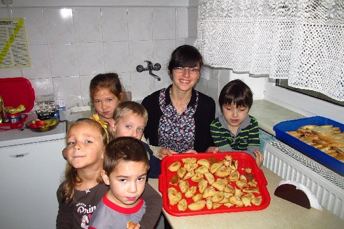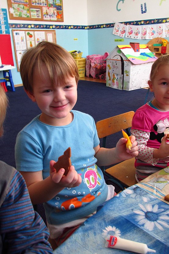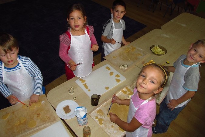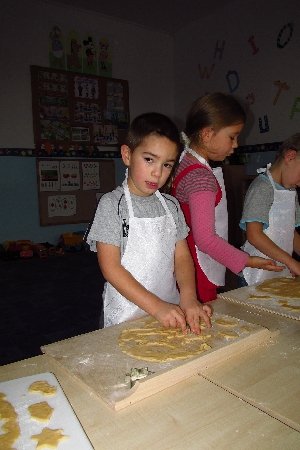 Tematem zajęć było nakrywanie do stołu i pieczenie ciasteczek. Właśnie ciasteczkami zajęliśmy się na początku. Nasza droga pani Renatka z kuchni przygotowała rano smakowite kruche ciasto. Każdy otrzymał kawałek, który sam rozwałkował i wyciął kształty przy pomocy specjalnych foremek. Potem nastąpiło przyozdabianie ciasteczek cukrem i cynamonem, oraz tworzenie nadziewanych jabłkiem pierożków.