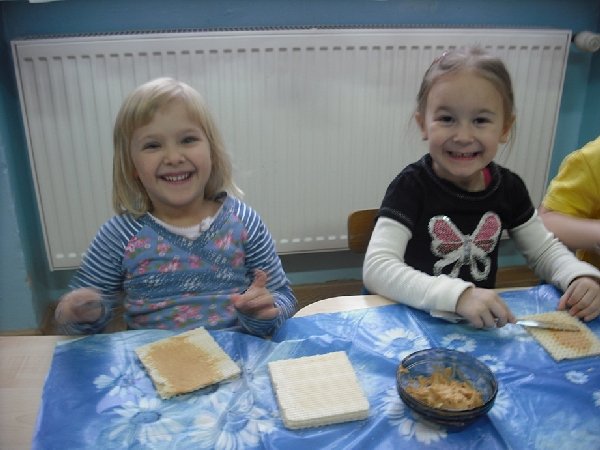 Gdy wszyscy byliśmy już gotowi, rozpoczęło się przygotowywanie kanapek. Jaka to była frajda! Można było wybierać spośród dostępnych produktów: serków topionych