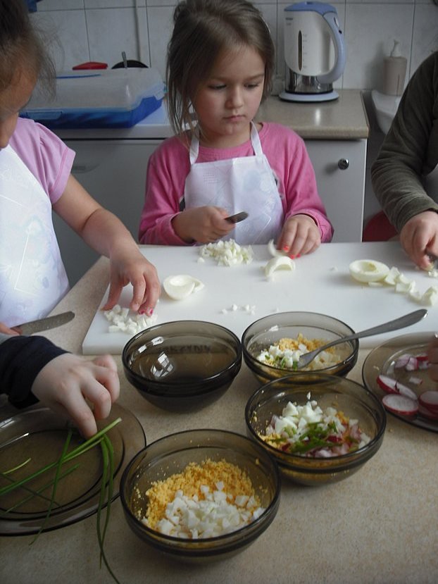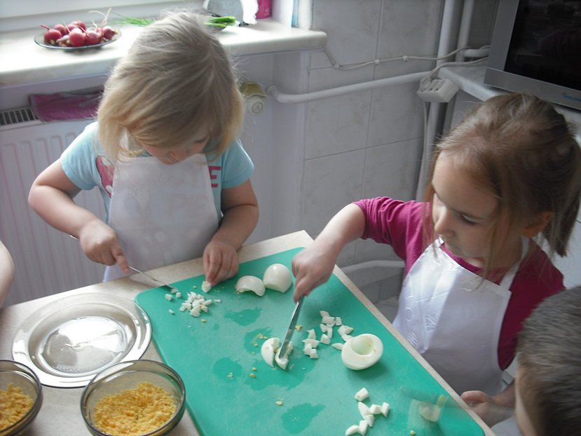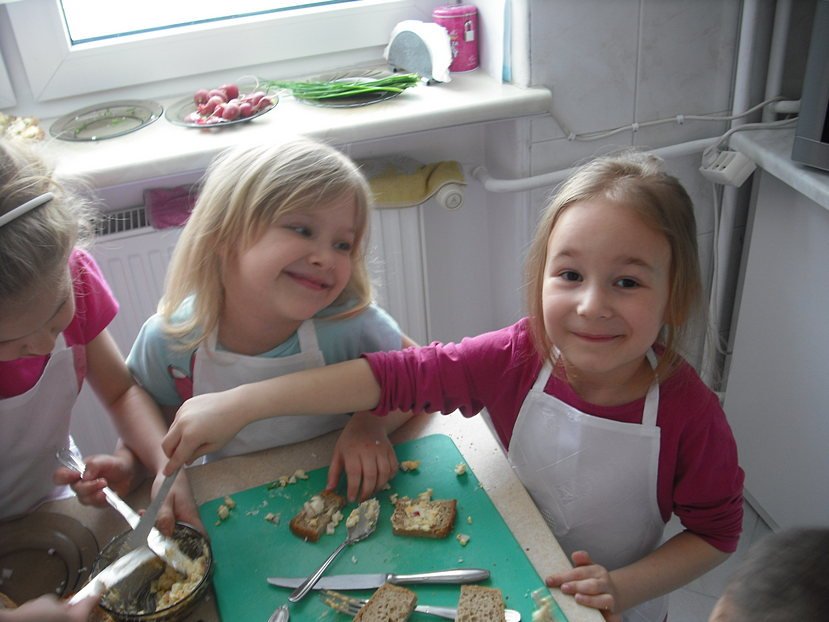 Na początek zajęliśmy się oczywiście tematem śniadaniowym. Już Smyki wiedzą, że śniadanie to najważniejszy posiłek dnia - wiele zależy od niego, np. to, jak będziemy funkcjonować aż do wieczora. My postanowiliśmy przygotować smaczne pasty, które może jeść ze smakiem cała rodzina. Podczas zajęć każdy miał własny przydział prac: niektóre dzieci kroiły białko, inne rozdrabniały żółtko, jeszcze inne kroiły szczypiorek i rzodkiewkę. Następnie wszystkie składniki połączyliśmy ze sobą, dodając niewielką ilość majonezu. Na koniec troszkę przypraw i już można było smarować ulubione pieczywo. Okazało się, że nasze kanapeczki wyszły wyśmienite! Każdy zajadał się nimi ze smakiem.