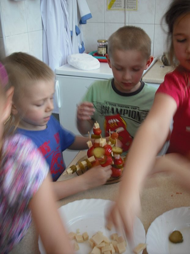 Szaszłyki okazały się bardzo dobrym pomysłem. Powstają one w mgnieniu oka, a efekt cieszy nie tylko małych, ale i dużych. Jak zwykle naszymi specjałami poczęstowaliśmy dzieci i pracowników Przedszkola Niepublicznego „Promyczek” i (nie chcemy się chwalić), ale usłyszeliśmy wiele miłych słów na temat naszych kulinarnych dzieł sztuki. Mamy nadzieję, że naszym rodzicom również będą smakować!