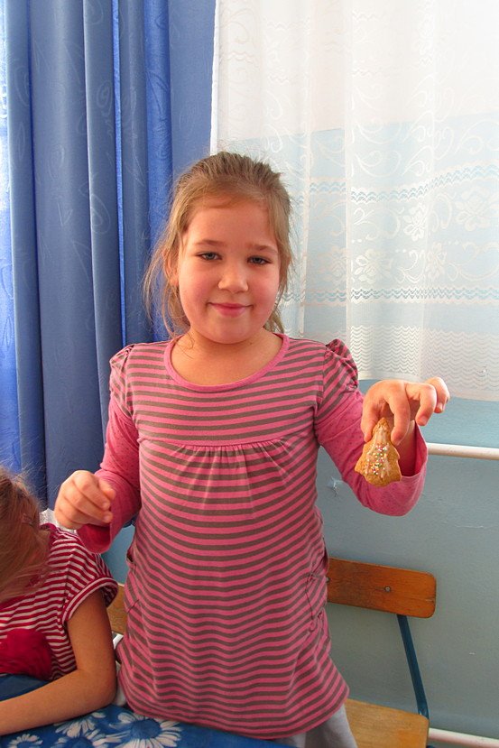 Dzięki uprzejmości pani kucharki mogliśmy zajrzeć nawet w najdziwniejsze kąciki kuchni – odwiedziliśmy pełną zapasów spiżarnię, zajrzeliśmy do pomieszczenia, gdzie przygotowywane są posiłki, sprawdziliśmy nawet zawartość szafek. Największe zdziwienie wzbudziły w nas rozmiary garnków, w których panie gotują potrawy. Pani Stasia odpowiedziała na wiele naszych pytań – dzięki niej dowiedzieliśmy się nieco o kuchni polskiej i jej specjałach. Mieliśmy również okazję spróbowania pysznych faworków.