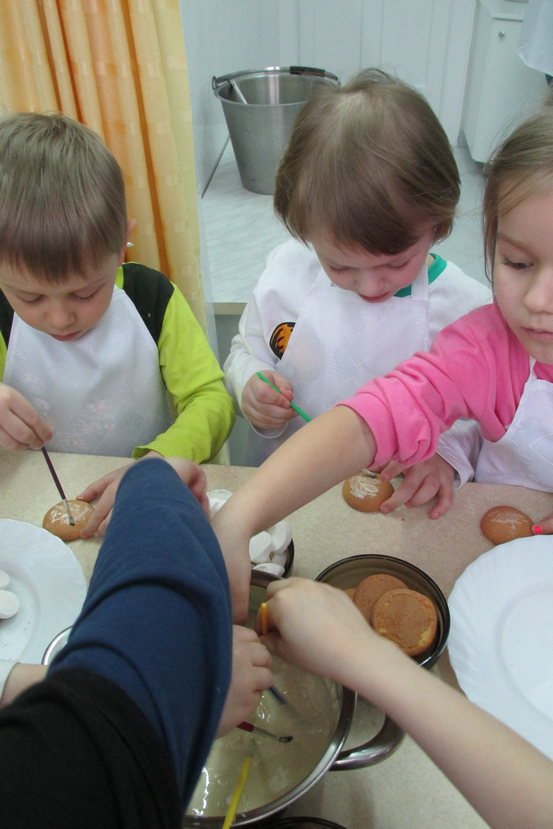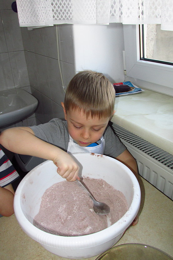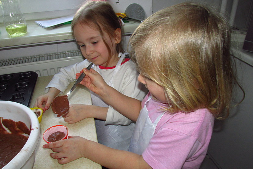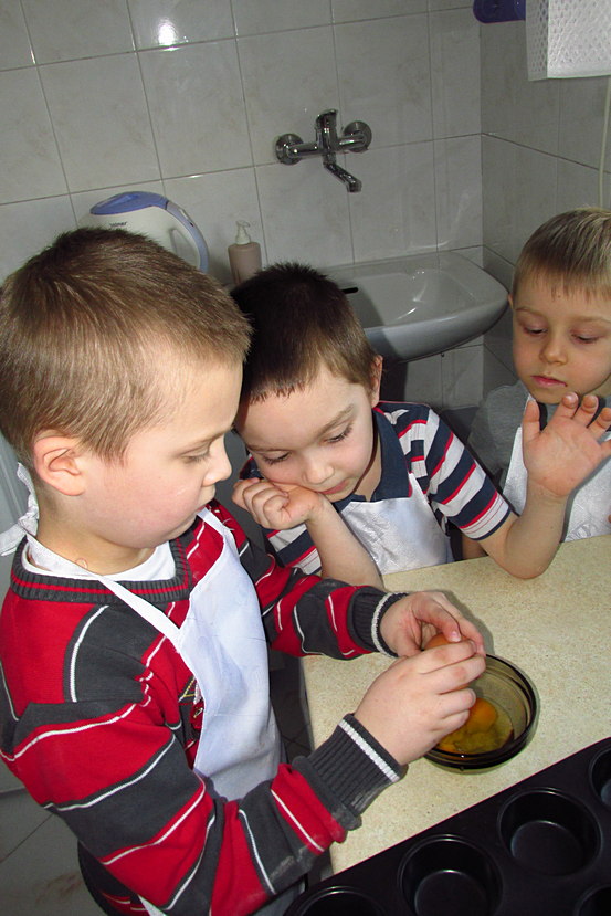 Dzieci ochoczo zabrały się do pracy. Najpierw wszyscy ustalili co będzie potrzebne do upieczenia babeczek. Pani Ul powiedziała, że przygotowane produkty należy podzielić na składniki na „suche” oraz „mokre” i umieścić je w oddzielnych miskach. Następnie każdy mieszał ile sił w małych rękach tak, aby produkty w obu naczyniach połączyły się. Kolejnym krokiem było dodanie „mokrych” składników do „suchych” i wymieszanie ich, ale tylko do połączenia zawartości obu naczyń. Gdy smakowicie pachnąca masa była gotowa dzieci dodały do niej pokruszoną czekoladę, a następnie napełniały słodką zawartością foremki do babeczek.