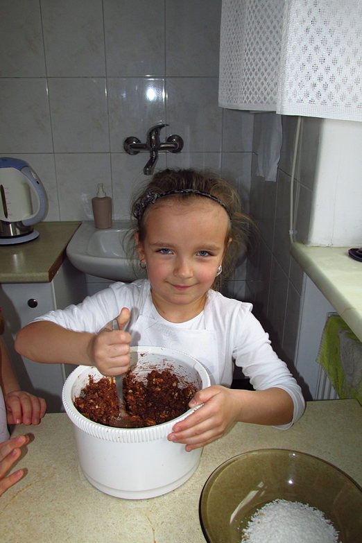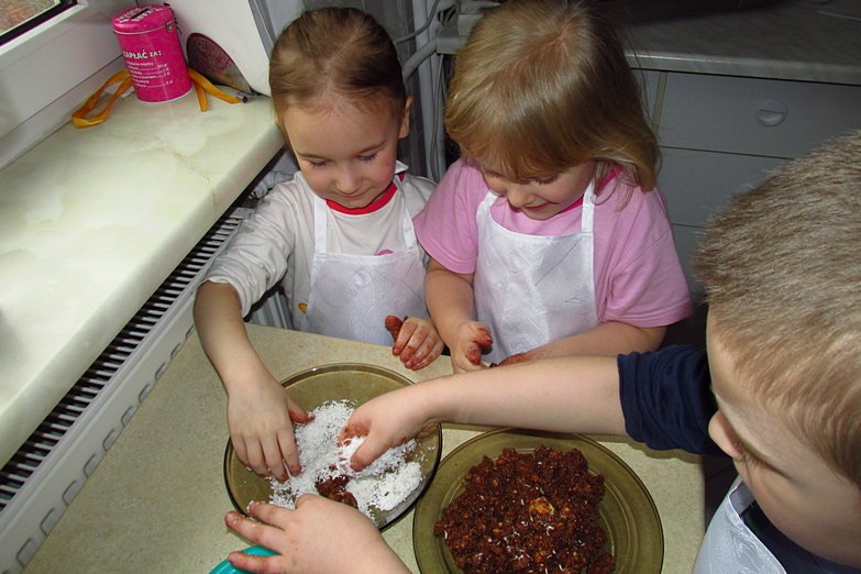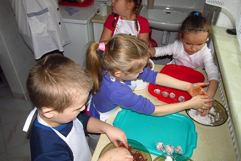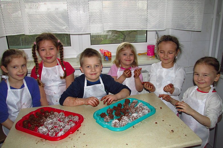 Tym razem na zajęciach przygotowaliśmy coś, co wszystkie dzieci uwielbiają – kuleczki czekoladowe! Przepis jest bardzo prosty – wystarczą herbatniki, masło, kakao i jajka, troszkę pracy, a efekt zadowoli każdego. Zabawy było przy przygotowywaniu tych pyszności co niemiara, bo ręce kleiły się od masy, a w brzuchach burczało od wspaniałego zapachu. Niestety z próbowaniem kulek trzeba było nieco poczekać, bo muszą one kilka godzin spędzić w lodówce.