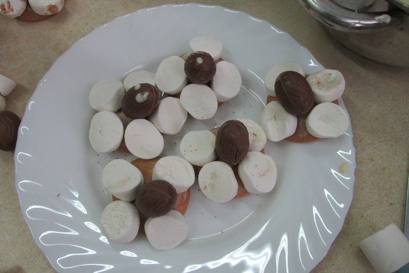 Na początku nie wiedzieliśmy zupełnie co pani Ula dla nas przygotowała – na stole pojawiły się biszkopty, pianki, czekoladowe jajka, a także zagadkowa biała masa (myśleliśmy, że to budyń, a to była po prostu biała czekolada!). Okazało się, że będziemy przygotowywać owieczki! Ochoczo zabraliśmy się do pracy.