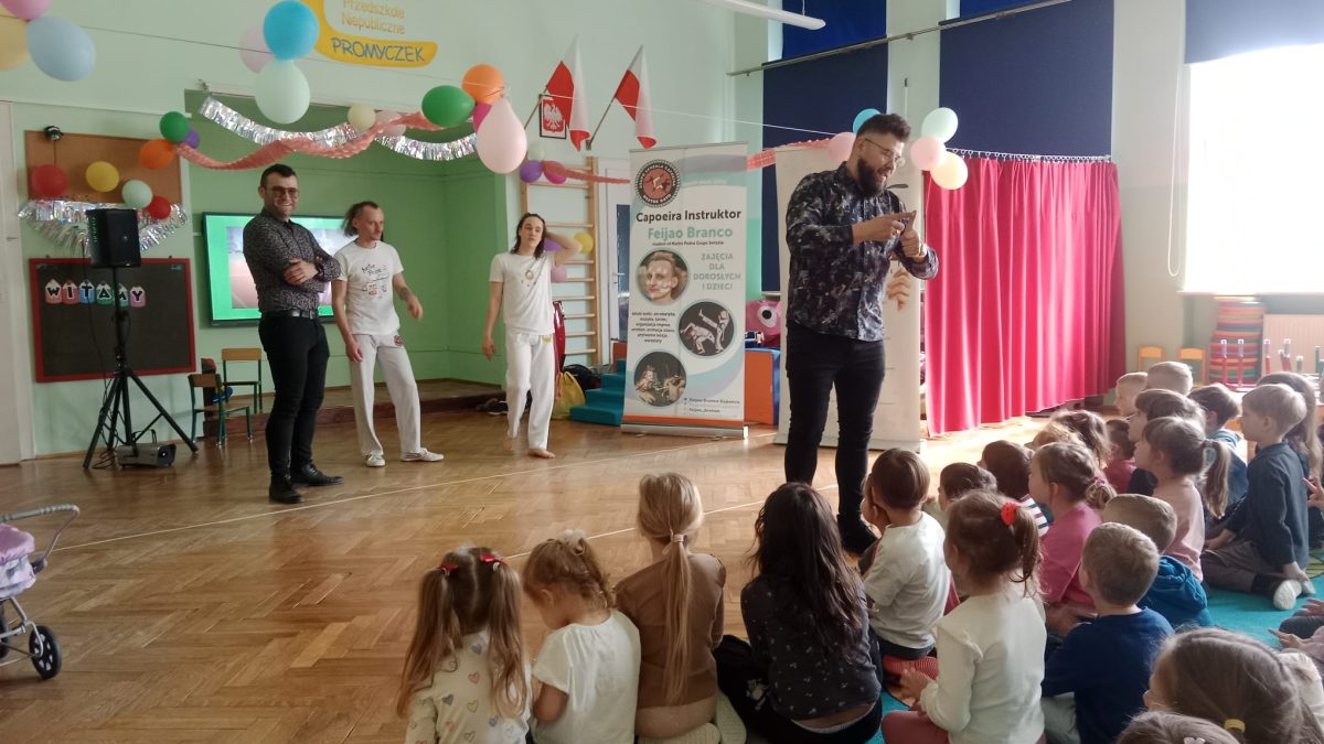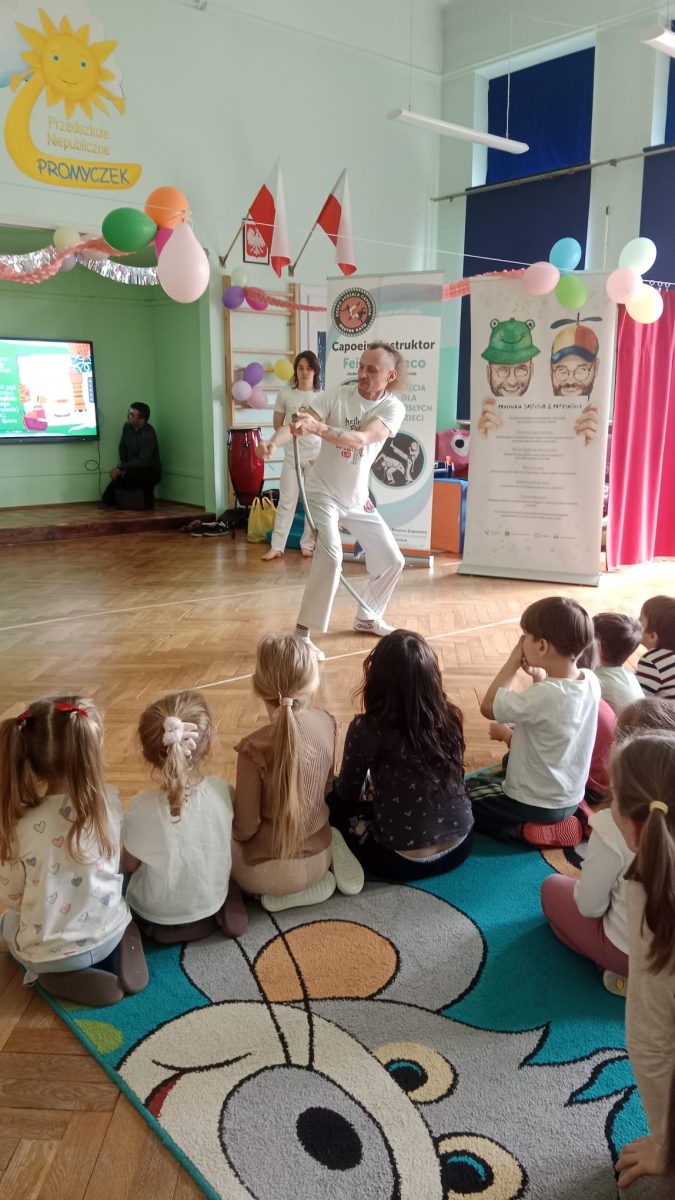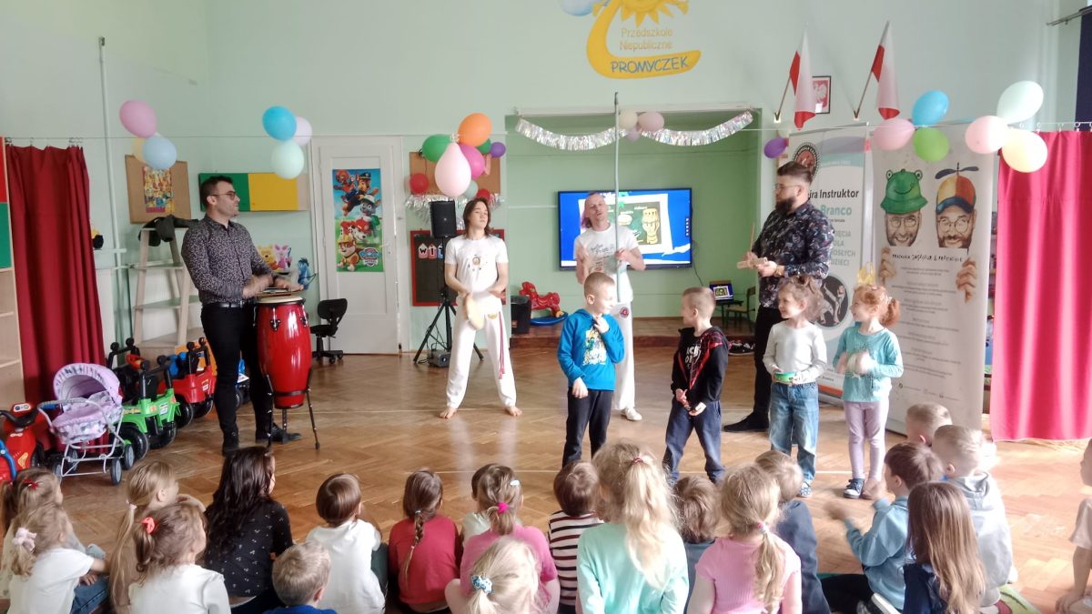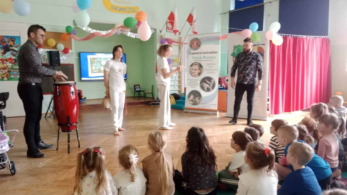 Kolejna wizyta Pracowni Jaszczur i Przyjaciele w naszym przedszkolu upłynęła pod znakiem mieszanki tańca, sztuki walki i muzyki. Dzieci dowiedziały się, że capoeira – bo o niej mowa, wywodzi się z dalekiej Brazylii. Przedszkolaki mogły podziwiać pokazy w wykonaniu profesjonalistów, wysłuchać dźwięków jakie wydają instrumenty pochodzące z południowo-amerykańskiej dżungli, a także same spróbować gry na nich. Dziękujemy muzykom za świetne przeżycie i czekamy na kolejne spotkania!
