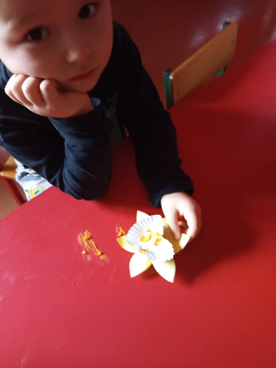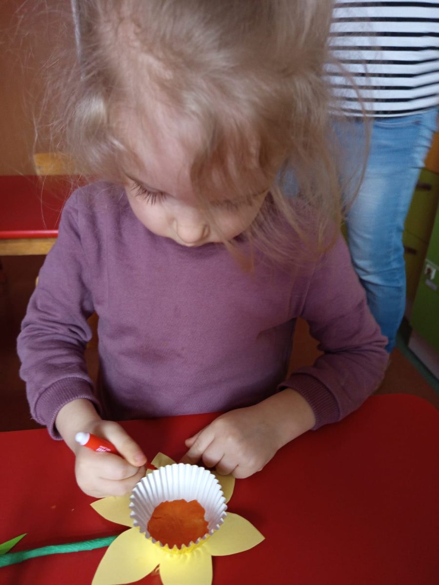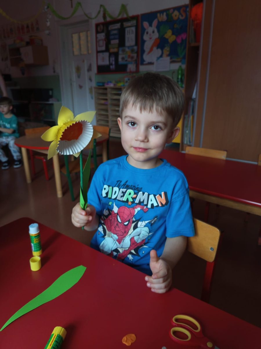 Nie zabrakło również kreatywnych działań plastycznych. Dzieci wykonywały różnorodne prace o tematyce wielkanocnej – kolorowe pisanki, baranki, kurczaczki i wiosenne dekoracje, które ozdobiły nasze sale, wprowadzając wszystkich w świąteczny nastrój.