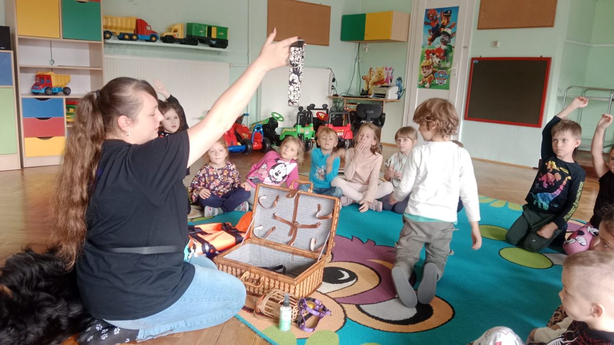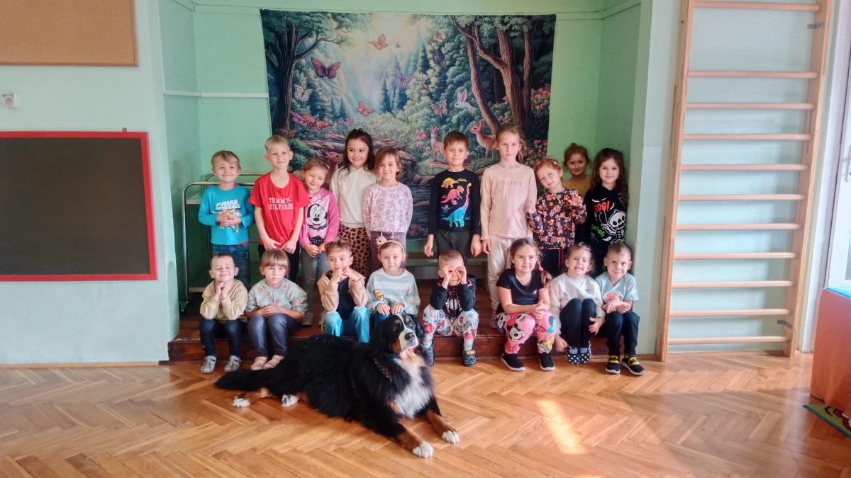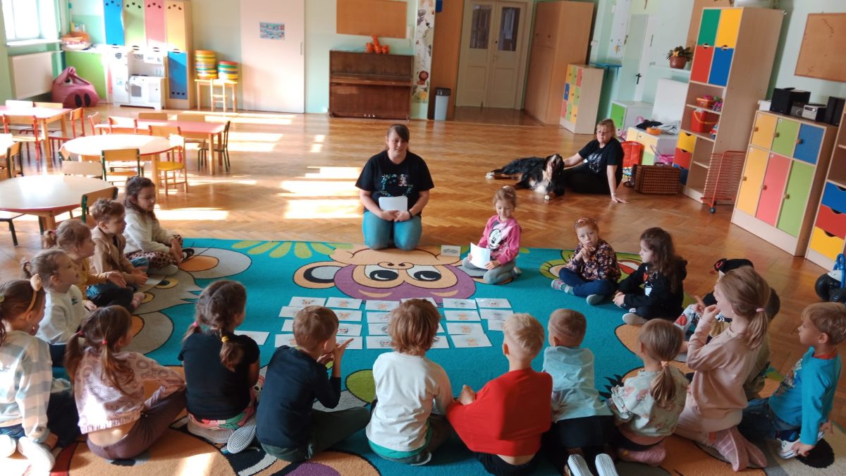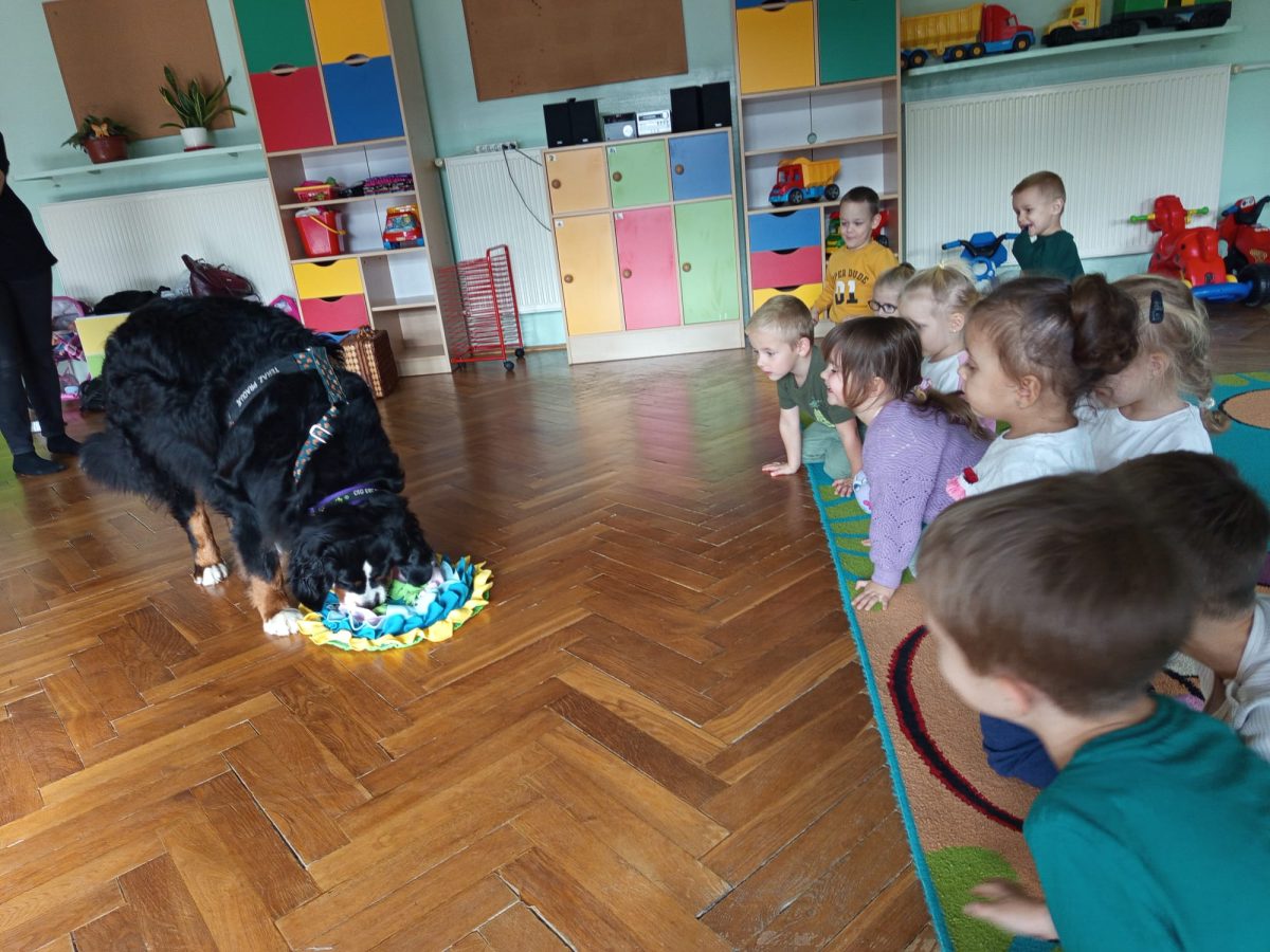 W dniu 8 października dzieci z naszego przedszkola uczestniczyły w swoich pierwszych zajęciach w tym roku szkolnym z dogoterapii. Na spotkanie przybyła sunia wraz ze swoją opiekunką. Przedszkolaki z dużym zainteresowaniem wysłuchały informacji o tym, jak należy opiekować się psem oraz jak bezpiecznie się z nim bawić. Każde dziecko miało okazję pogłaskać i nakarmić pieska, co sprawiło im wiele radości. Zajęcia przebiegły w miłej i spokojnej atmosferze, a dzieci już nie mogą doczekać się kolejnego spotkania.